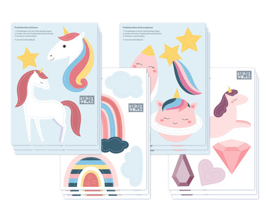 12 Bastelbögen mit Einhörnern, Regenbögen und Edelsteinen.
